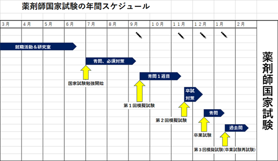 このように模擬試験を通して、自分の弱点や勉強の進捗を確認しながら進めていくのが一般的です。大学や予備校によって模擬試験や卒業試験の日程が異なる場合がありますので、個々のカレンダーに合わせて調整してください。
