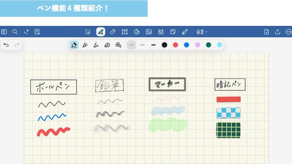まずペンはボールペン、鉛筆、マーカー、暗記ペンと4種類あり各種色、サイズ、全て自由に変更可能です。テスト勉強の時は特に暗記ペンが役に立ちます。