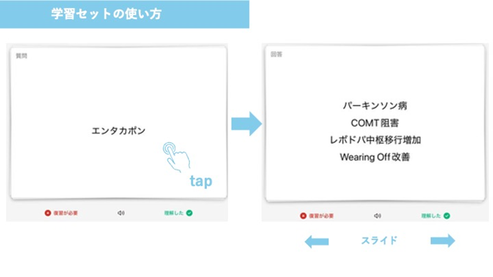 使い方はとても簡単。画像のように画面をタップすると解答が出てきます。 自分の記憶状況に合わせて、左右にスライドして仕分けていきましょう。